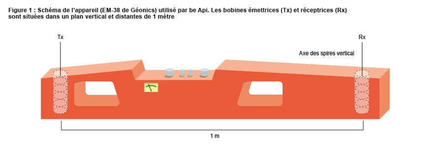 La transmission d’un champ électromagnétique dans le sol est fortement corrélée à sa conductivité apparente. Cette technique utilise deux bobines. La première, parcourue par un courant électrique d’une fréquence donnée produit un champ magnétique dit primaire de même fréquence qui induit dans le sol qu’il traverse des courants électriques, eux-mêmes générant à leur tour un  champ magnétique secondaire mesuré à l’aide de la seconde bobine. La conductivité apparente du sol (exprimée en milli-siemens par m) est calculée à partir du rapport entre la valeur du champ magnétique secondaire et celle du champ magnétique primaire et des caractéristiques de l’appareil de mesure (distance et position des deux bobines notamment). Ce type de mesure est facile à mettre en œuvre, sans perturbation du sol, ni prélèvement d’échantillon. L’appareil est simplement posé sur le sol ou traîné horizontalement sur un support dédié pour acquérir des mesures en continue. Il n’y a donc pas de problème de contact sol-sonde et la mesure est immédiate.