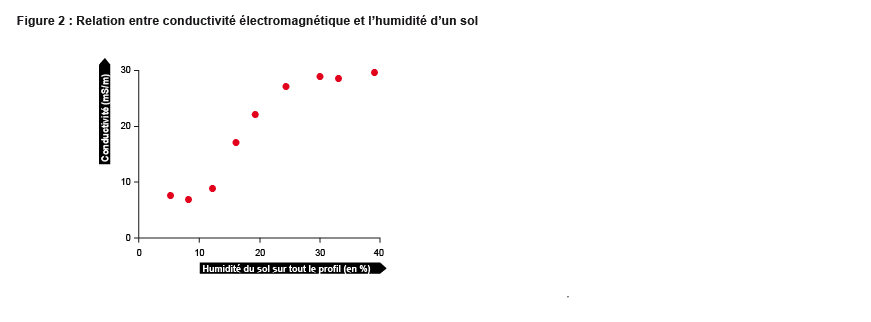 Les différentes tranches de sol (0 à 30 cm, de 30 à 60 cm, de 60 à 90 cm et de 90 à 120 cm) contribuent respectivement de 45, 20, 10 et 5 % à la mesure globale. L’impact des tranches plus profondes étant moins important. Ainsi, un sol présentant une texture légère en surface et plus argileuses en profondeur peut donc présenter une conductivité globale (mesurée sur toute l’épaisseur) équivalente à un sol de texture limoneuse. Ce point illustre l’impact du profil pédologique et de l’agencement vertical du sol.