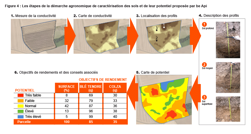 Une fois la carte de conductivité établie, il est nécessaire de l’interpréter et de caractériser précisément chaque zone. La méthode utilisée par be Api a été calée par sa filiale R&D Défisol, et a été éprouvée sur plus de 10 000 hectares dans différentes régions françaises. Cette interprétation se fait en trois temps :