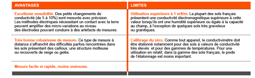 De nombreux articles scientifiques évaluent les avantages et inconvénients de la méthode de mesure électromagnétique (sans contact avec le sol) comparativement à d’autres (BURLAN-ROTAR et al., « Consideration on contactless electromagnetic techniques for measuring soil conductivity ». Buletinul AGIR, Supliment 1/2015, pp. 18-26) :