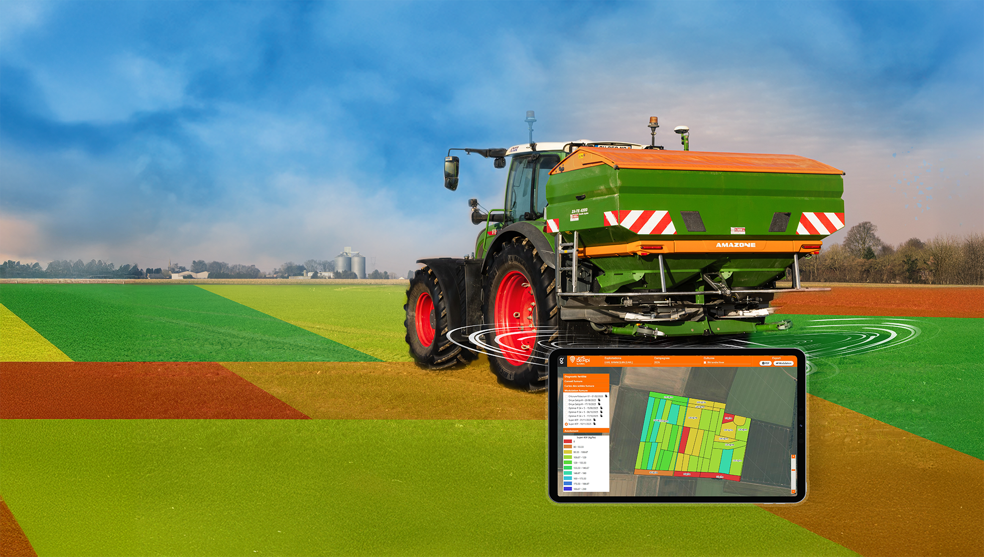 Les données et les cartes des deux précédentes étapes, diagnostic et conseil, sont mises à votre disposition sur la plateforme Agriculteur MonbeApi. Diagnostics de fertilité des sols peuvent y être visualisés pour l’ensemble de l’exploitation, tout comme les cartes de conseil. C’est également sur cette plateforme que vous téléchargerez vos fichiers de modulations adaptés à vos équipements.